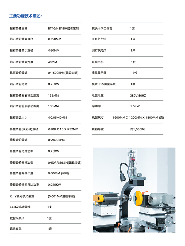 機(jī)床主軸砂輪作為被修整的金剛石砂輪或CBN砂輪,附件上所安裝的砂輪作為修整砂輪即綠色碳化硅砂輪;被修整砂輪二個(gè)方向可以調(diào)整,即X軸、Y軸;修整砂輪有三個(gè)方向可以調(diào)整,即旋轉(zhuǎn)A軸、X1軸和Y1軸,并且可以變頻調(diào)速的往復(fù)擺動(dòng),除此之外,X1軸和Y1軸之間可以旋轉(zhuǎn)和定位,可以實(shí)現(xiàn)修整砂輪做180°旋轉(zhuǎn);機(jī)床配有CCD光學(xué)測(cè)量系統(tǒng)、光柵尺數(shù)顯測(cè)量系統(tǒng)、10到100倍之放大系統(tǒng)、液晶顯示器。